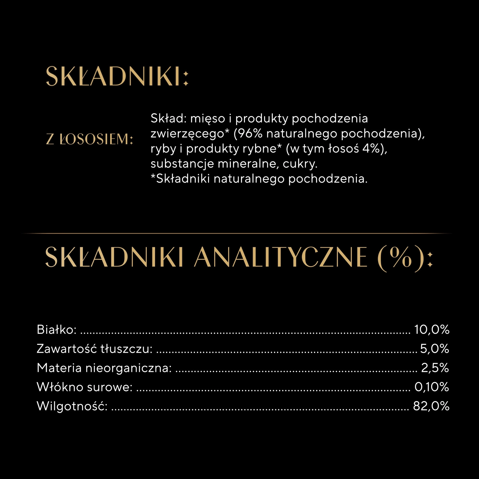 Ingredients: Meat and animal derivatives* (96% natural origin), fish and fish derivatives* (including 4% salmon), minerals, sugars. *Ingredients of natural origin.