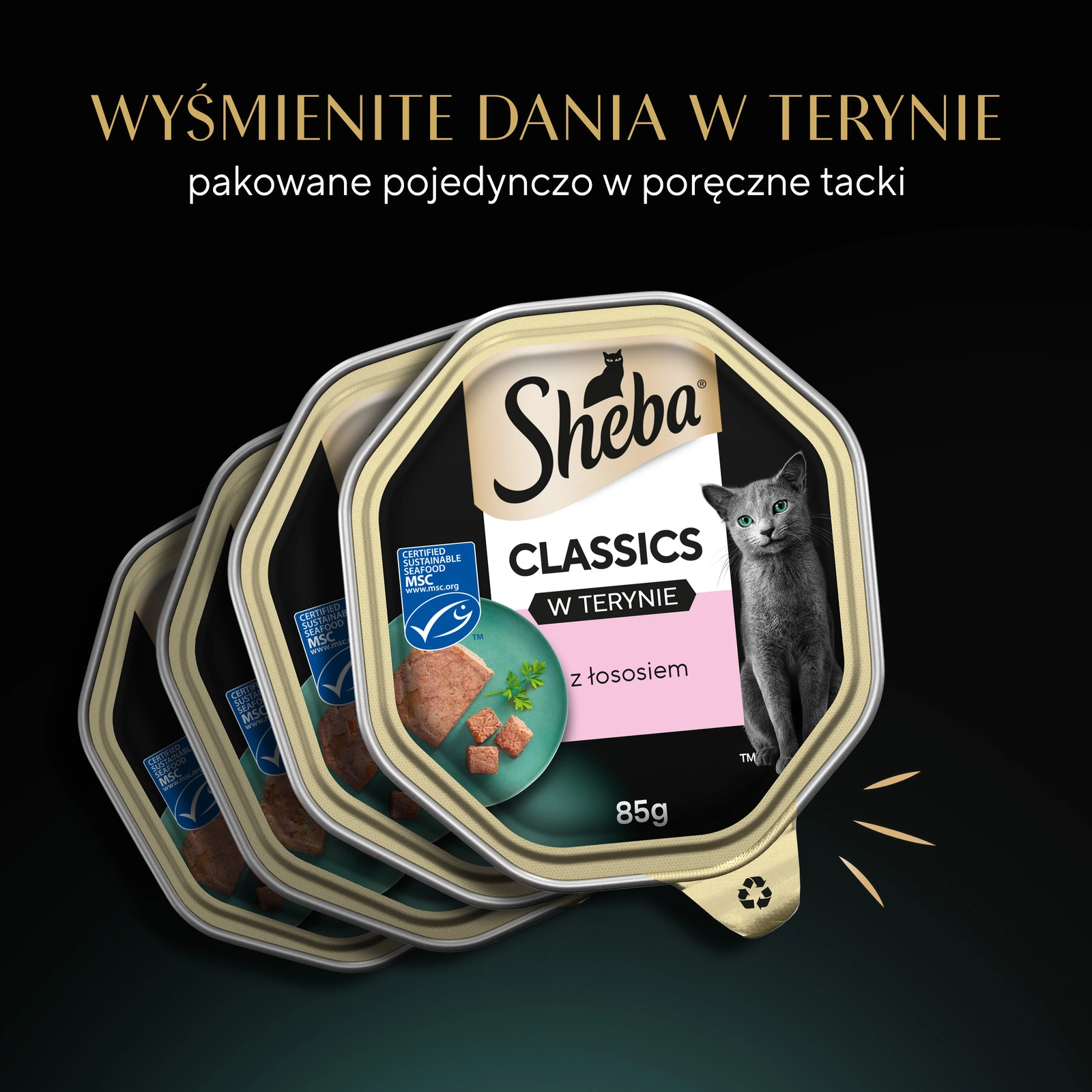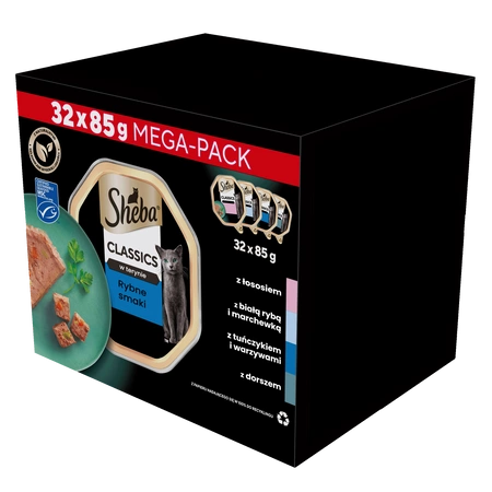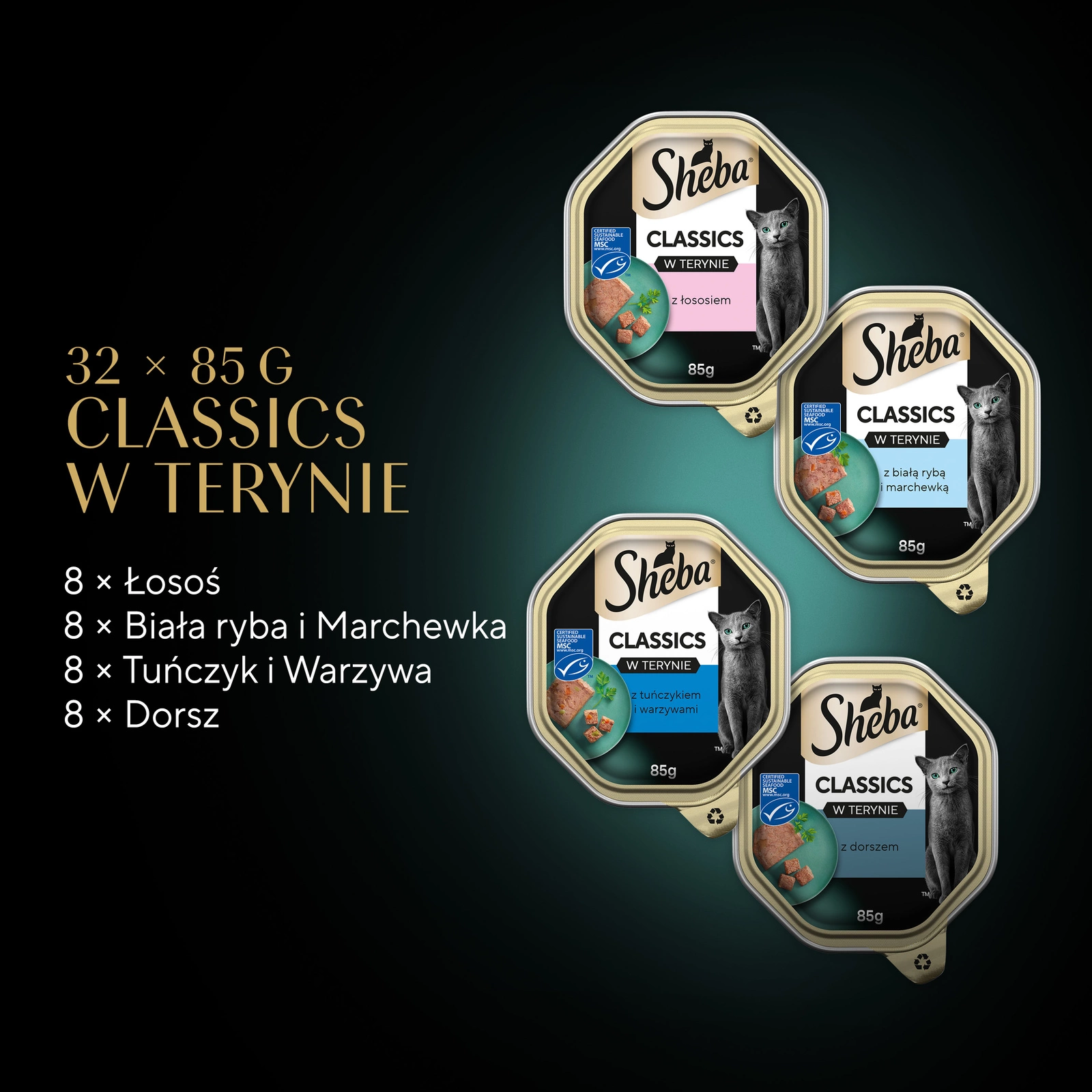 • SHEBA Classics Fish Flavours trays 32x85 g – complete wet food for adult cats, in jelly (with salmon, white fish and carrots, tuna and vegetables, cod)