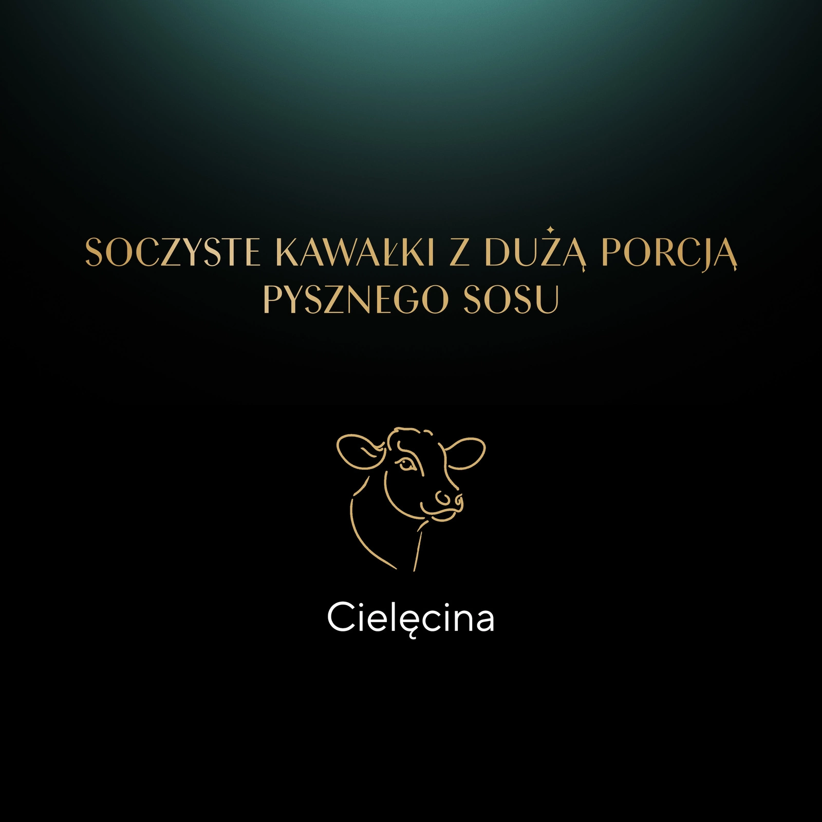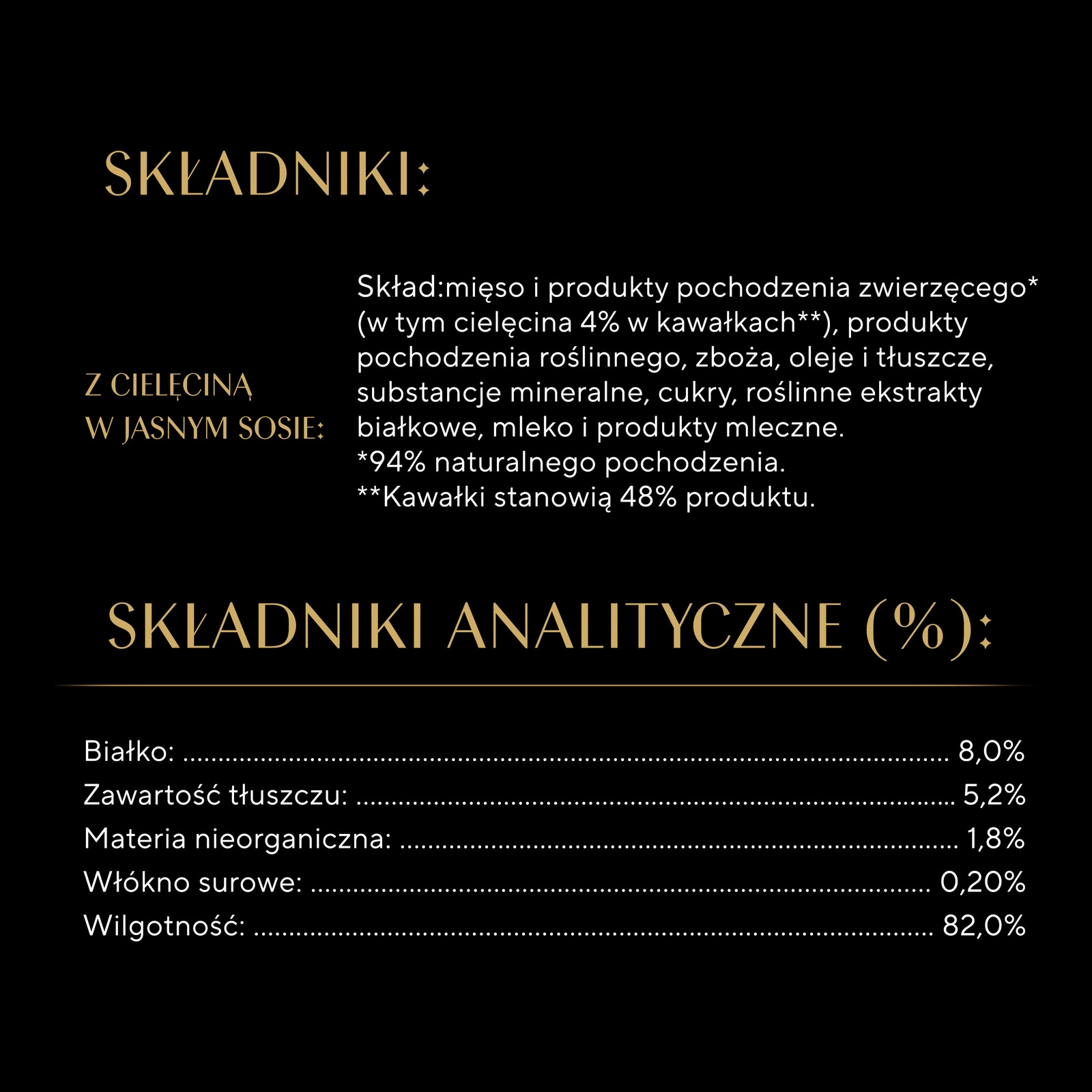 Ingredients: Meat and animal derivatives* (including veal 4% in chunks**), derivatives of plant origin, cereals, oils and fats, minerals, sugars, vegetable protein extracts, milk and dairy products. *94% natural origin. **Chunks constitute 48% of the product.
