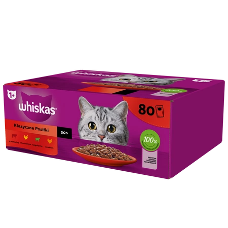 WHISKAS Adult pouches 80 x 85 g Classic Meals – wet food for adult cats, in sauce (pieces with: beef, chicken, lamb, poultry)