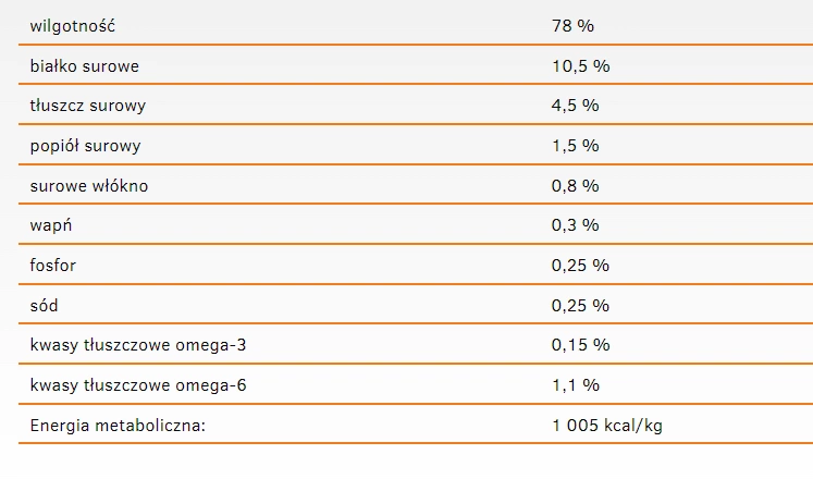 Complete wet food, calorically balanced. The recipe consists of a limited number of ingredients and a single protein source. It is grain-free and gluten-free, making it easy to digest. It contains 100% defined ingredients of the highest quality. The food contains essential taurine, which is particularly important for vision and heart function. Cats are unable to produce it themselves and must therefore receive it as a supplement.