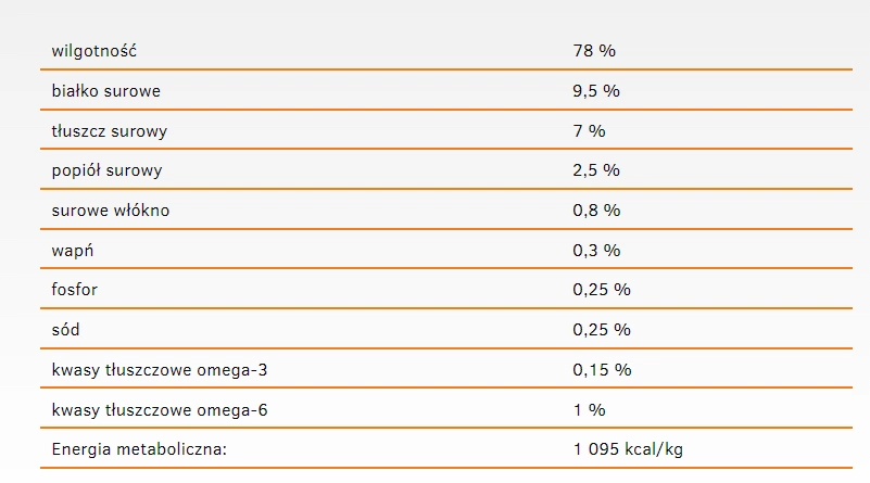 Nutritional additives per 1 kg: vitamin A (3a672a) 800 IU, vitamin D3 (3a671) 200 IU, vitamin E (3a700) 120 mg, taurine (3a370) 800 mg, vitamin B1 (3a821) 1 mg, biotin (3a880) 0.4 mg, zinc (3b606) 10 mg, manganese (3b504) 2.4 mg, iodine (3b201) 0.6 mg, copper (3b406) 3.2 mg, iron (3b106) 8 mg.