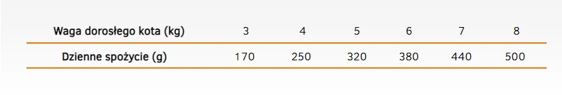 Nutritional additives per 1 kg: vitamin A (3a672a) 800 IU, vitamin D3 (3a671) 200 IU, vitamin E (3a700) 120 mg, vitamin B1 (3a821) 1 mg, taurine (3a370) 800 mg, biotin (3a880) 0.4 mg, zinc (3b606) 10 mg, manganese (3b504) 2.4 mg, iodine (3b201) 0.6 mg, copper (3b406) 3.2 mg, iron (3b106) 8 mg.