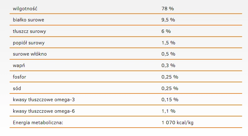 The recipe contains essential taurine, which is particularly important for visual function and heart function. Cats cannot produce it themselves and must therefore receive it as a supplement. This food contains salmon oil – a source of unsaturated omega-3 fatty acids (EPA, DHA), which have a beneficial effect on brain development and support the physiological functions of skin and coat, improving their quality. Omega-3 also has anti-inflammatory properties.