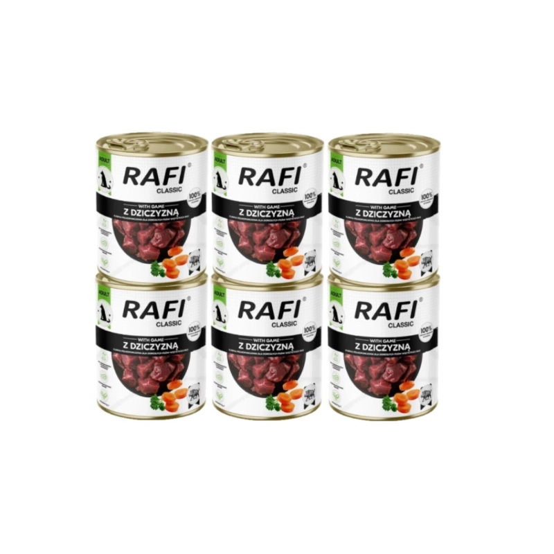 Rafi Classic with Game contains meat and animal derivatives, including game, which is a source of easily digestible protein and fatty acids. A sufficient amount of fat provides energy for daily activity, while a complex of vitamins and minerals helps maintain healthy adult dogs.