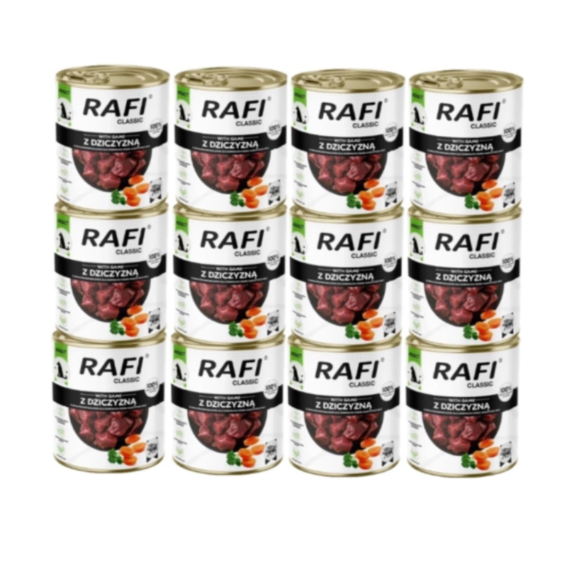 Rafi Classic with Game contains meat and animal derivatives, including game, which is a source of easily digestible protein and fatty acids. A sufficient amount of fat provides energy for daily activity, while a complex of vitamins and minerals helps maintain healthy adult dogs.