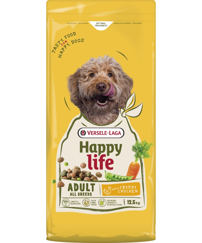 Happy Life Adult with Chicken is a tasty, varied food that provides active adult dogs with all the nutrients they need. 100% complete and balanced: this food provides the right balance of proteins, fats, carbohydrates, vitamins, and minerals essential for your dog's health and well-being.