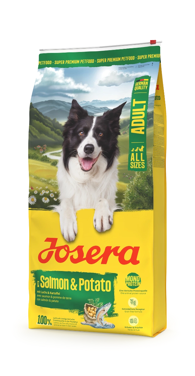 Dogs with sensitive digestive systems will love Josera Salmon & Potato. This grain-free dog food with 100% salmon is distinguished by its delicious taste and excellent tolerability, especially for dogs with sensitive stomachs. Salmon is not only a valuable source of omega-3 fatty acids, supporting healthy skin and a shiny coat, but it is also the only type of animal protein, making this food a mono-protein formula. Potatoes, selected herbs, and fruit complement the ingredients, creating a complete, balanced, and exceptionally tasty food for dogs of all breeds and sizes.