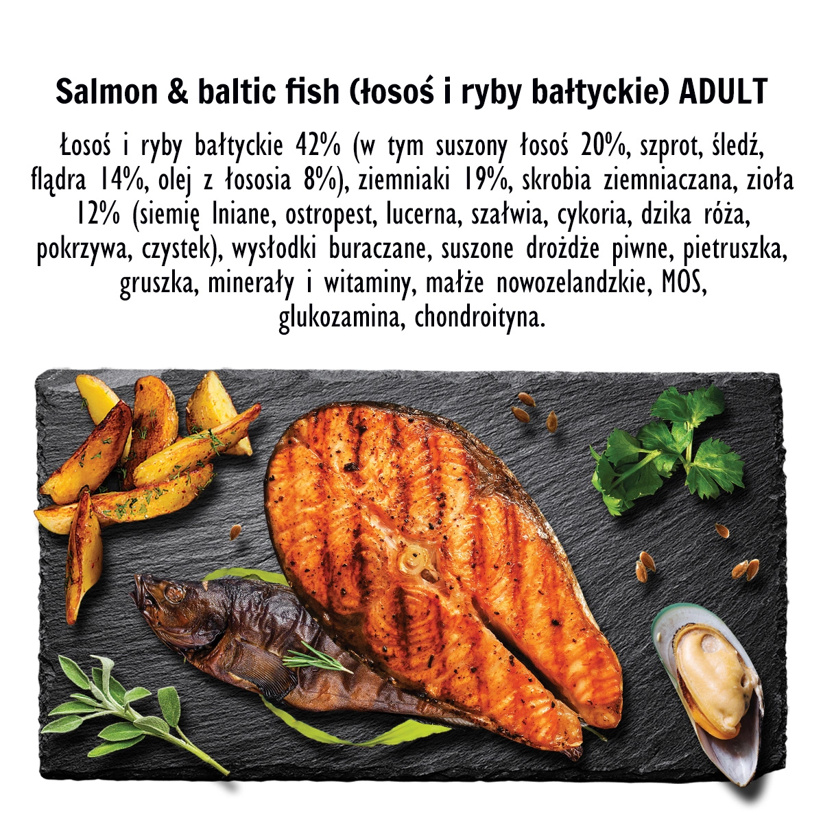 A perfectly balanced, SUPER PREMIUM quality dry food free from grains, peas, corn, soy, preservatives, and artificial colors. Top-quality salmon, Baltic fish, vegetables, and herbs sourced from local suppliers ensure high palatability and easy digestibility. An ideal formula for dogs with sensitive stomachs and grain intolerances.