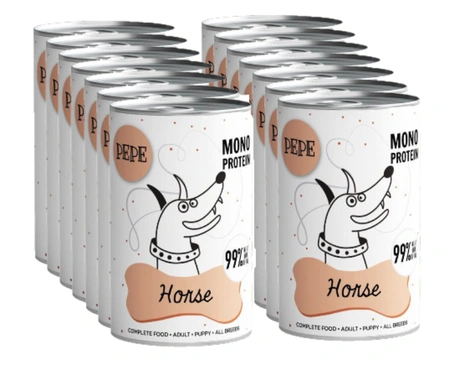 Take care of your dog's health and well-being with PEPE Horse – a complete, natural wet food based on horse meat. It's ideal for dogs of all ages, including puppies. The mono-protein composition supports proper body function and well-being.