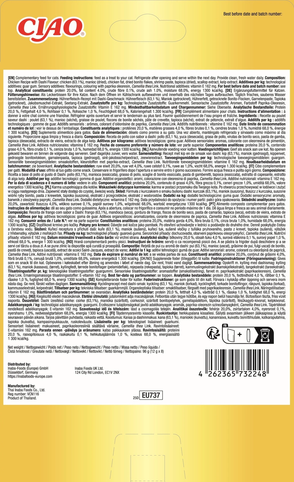 Complementary cat food. Formulated with chicken and dashi broth flavor.
