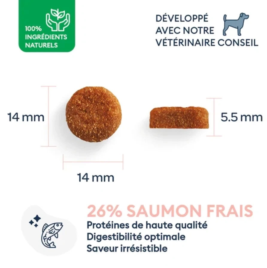 Our dry dog food for medium breed dogs, featuring fresh salmon and superfoods, supports your pet's vitality and overall health. Rich in omega-3 fatty acids and natural antioxidants, it helps strengthen the immune system and promote optimal digestion. Made with 100% natural ingredients, it promotes long-lasting well-being. This formula provides the perfect balance of energy, digestive health, and immune support. Fresh salmon and functional ingredients like L-carnitine make it the ideal diet for active, healthy dogs.