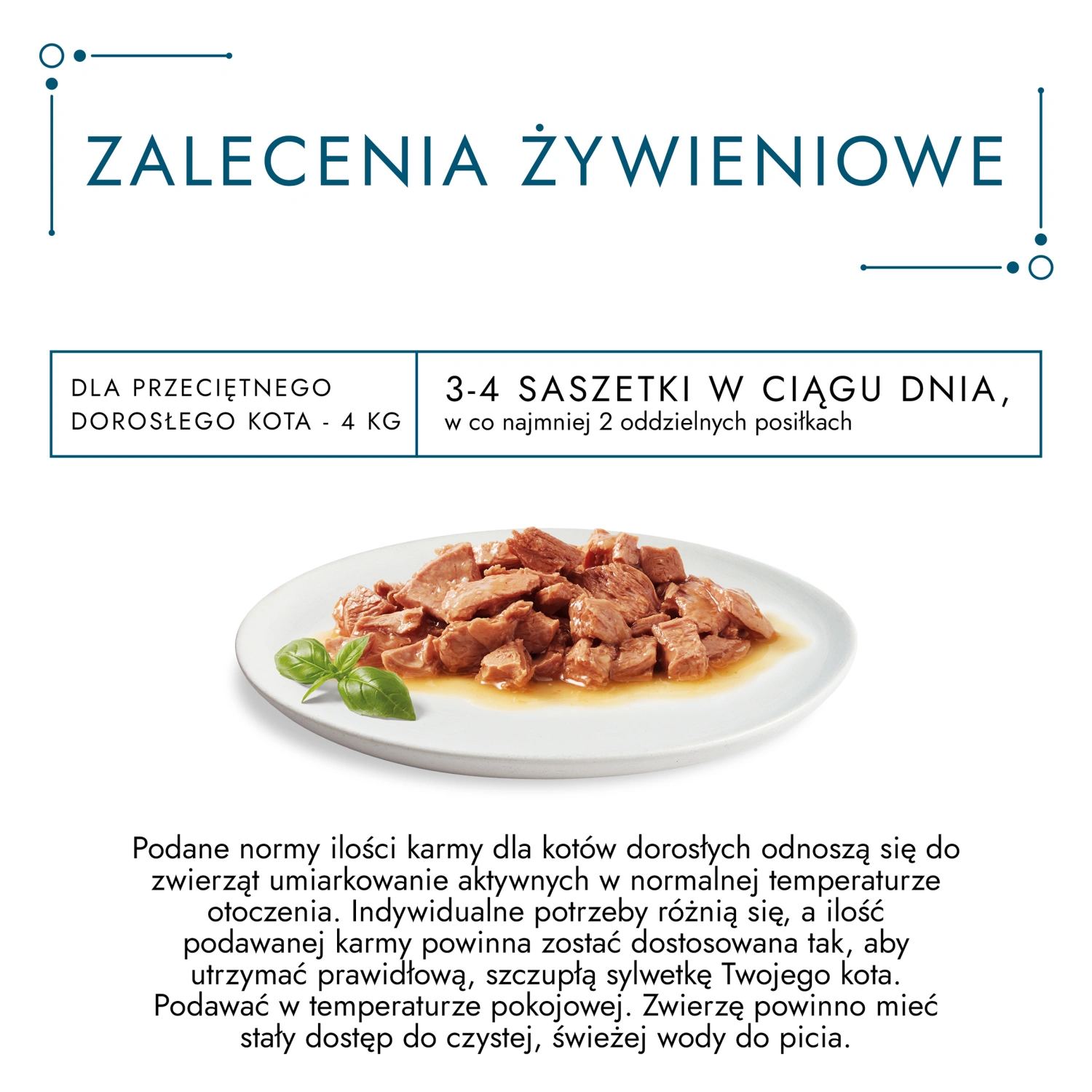 Feeding Recommendations: For an average adult cat weighing approximately 4 kg, it is recommended to feed 3 to 4 pouches daily, in at least 2-3 separate meals. The recommended feeding amounts for adult cats are based on moderately active cats at normal ambient temperatures. Individual needs vary, and feeding amounts should be adjusted to maintain a healthy, lean body mass for your cat. Serve at room temperature. Your cat should have constant access to clean, fresh drinking water.