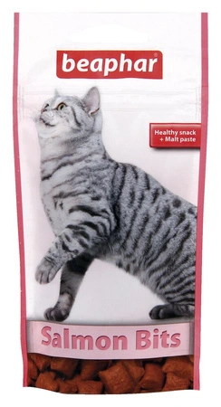 Salmon Bits are crunchy treats filled with salmon-flavored malt paste, which helps naturally expel hairballs accumulated in the stomach. Regular consumption of Salmon Bits or Malt Bits alleviates problems associated with excessive hair accumulation in a cat's digestive tract.