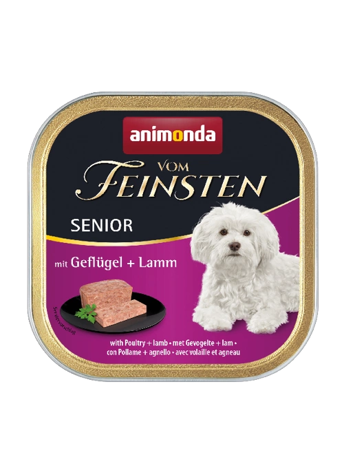 - Wet food for dogs over 7 years of age, with poultry flavour with lamb. 150g pack.