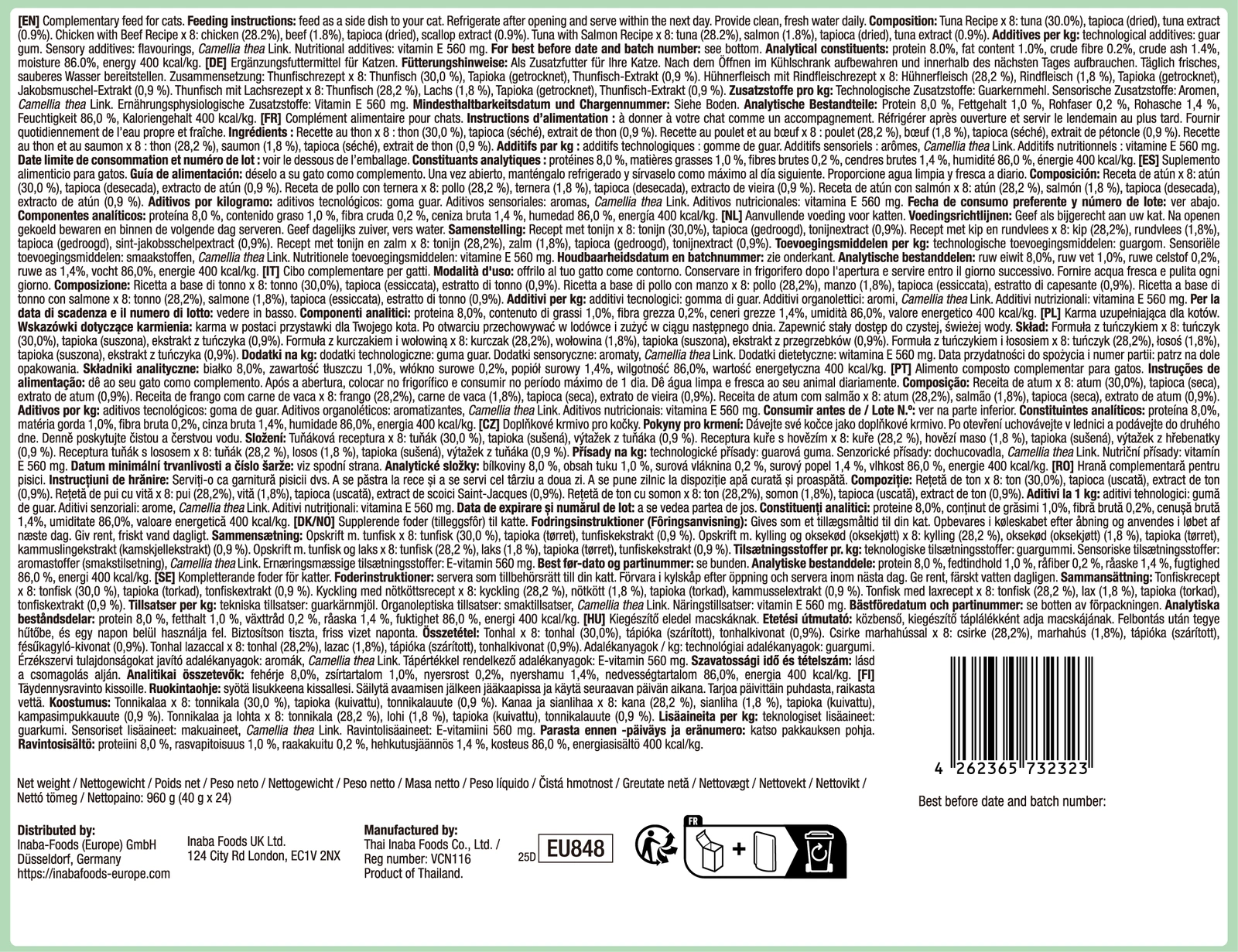 Ingredients: Chicken and Beef Formula: chicken (28.2%), beef (1.8%), dried tapioca, scallop extract (0.9%). Tuna and Salmon Formula: tuna (28.2%), salmon (1.8%), dried tapioca, tuna extract (0.9%). Tuna Formula: tuna (30.0%), dried tapioca, tuna extract (0.9%).