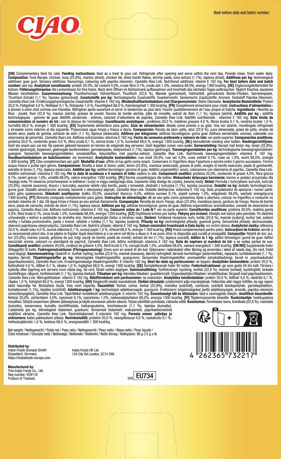 Ingredients: chicken, tuna (22.8%), cassava (dried), chicken fat, dried bonito flakes, shrimp paste, tuna extract (1.1%), tapioca (dried).