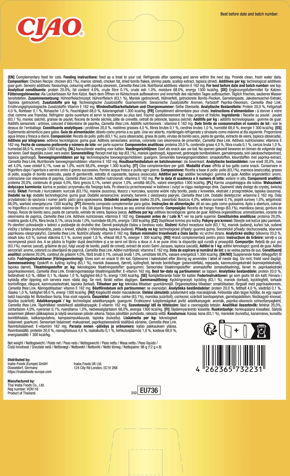 Feeding instructions: This food is a treat for your cat. Once opened, store in the refrigerator and use within the next day. Ensure your cat always has access to fresh water.