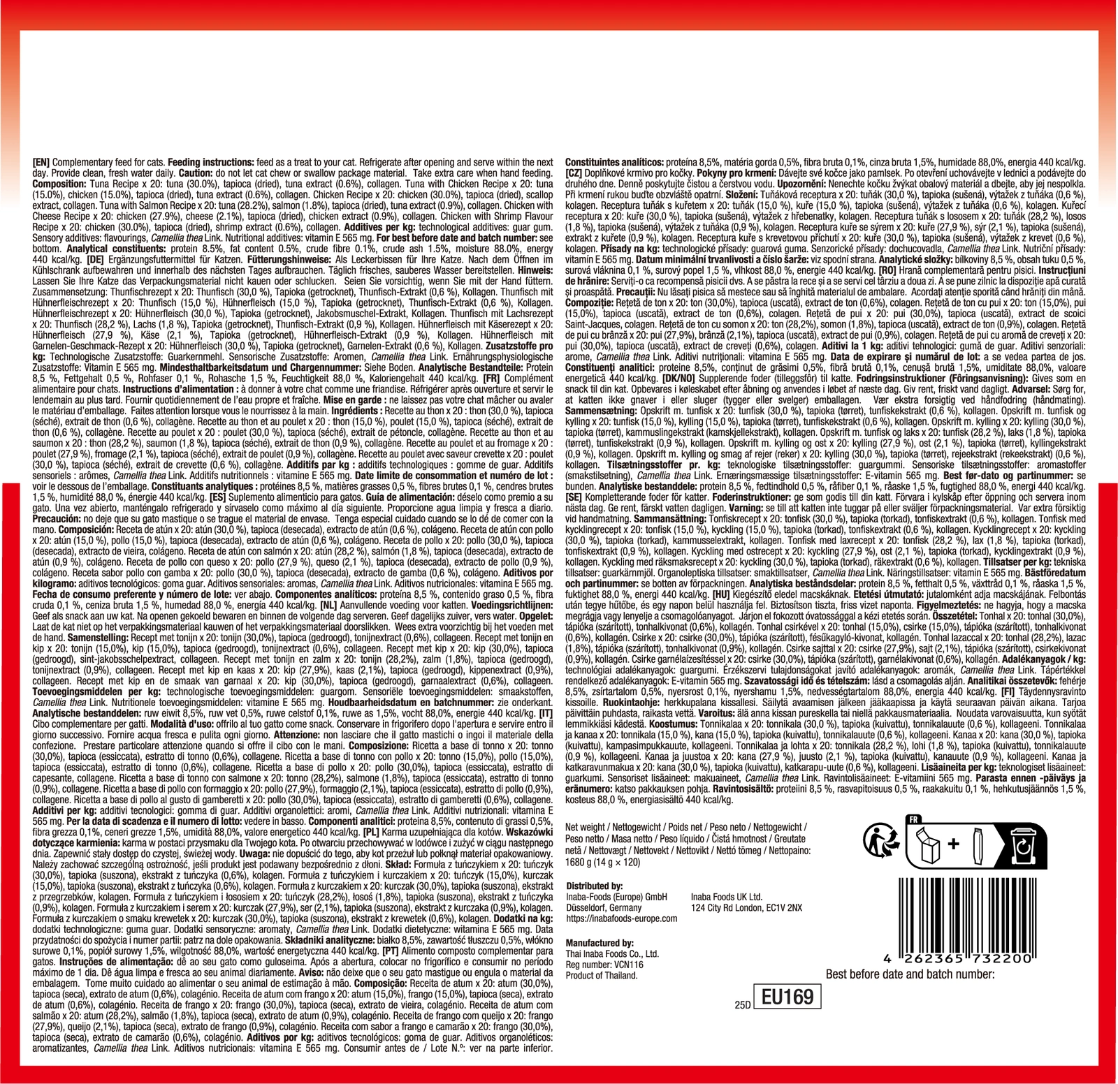 Churu treats are low-calorie, grain-free, and preservative-free. They are made with free-range chickens raised naturally on carefully monitored farms and sustainably caught, certified dolphin-safe deep-sea tuna.