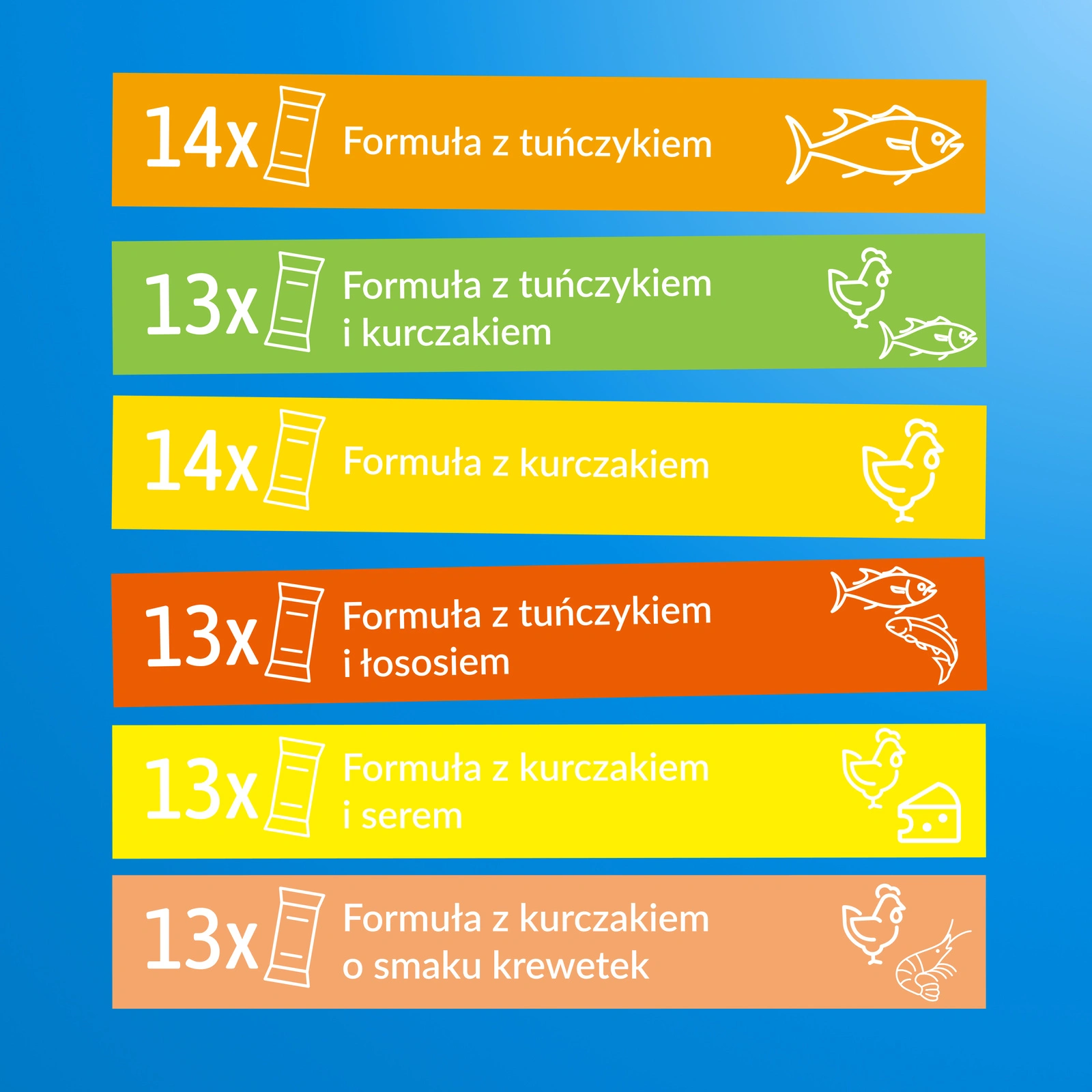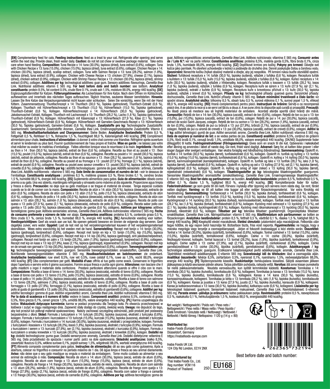 - Complementary cat food. A mix of treats with tuna and chicken.