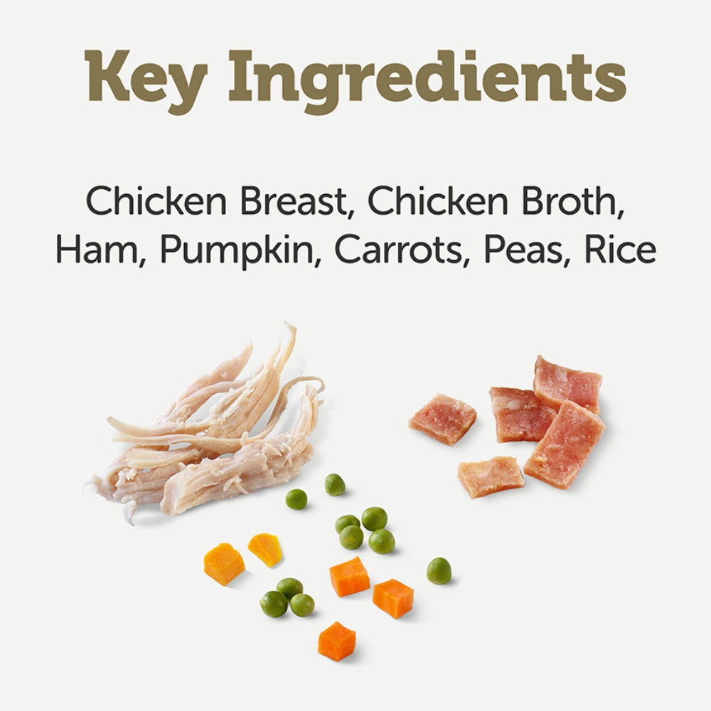 Chicken breast 28%, chicken broth, ham 15%, pumpkin 8%, carrots 8%, peas 8%, rice