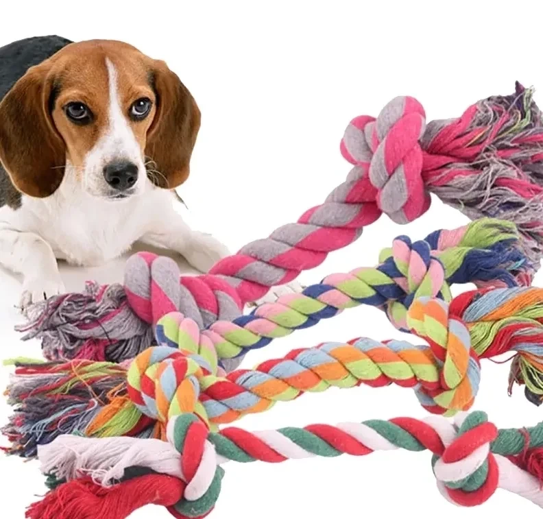 The toy is made of thick, tightly woven, colorful cotton rope that is very durable.