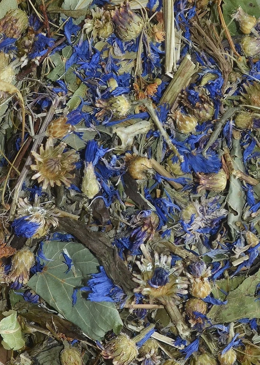 Ingredients: dried coltsfoot, mint, cornflower blossom, birch bark, linden leaf, sage, ribwort plantain, lemon balm, nettle.