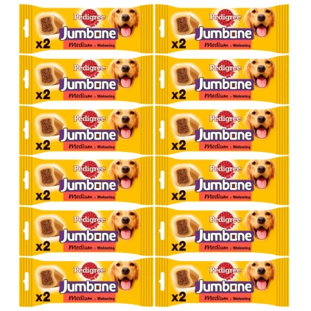 Pedigree Jumbone is the perfect, encouraging intense chewing treat for adult dogs. This Pedigree snack is a safe alternative to bones, as there is no risk of injury when it is crushed. The perfectly thought-out combination of crunchy shell and juicy filling encourages chewing and keeps you occupied for a long time. This treat is loved by dogs and thus tastes simply fantastic. In addition, the treat is rich in valuable vitamins, minerals, calcium and Omega - 3 fatty acids.