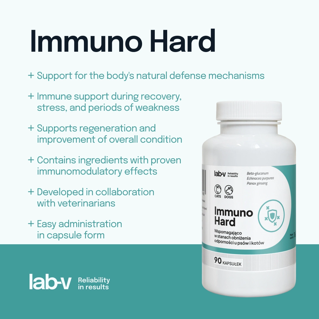 Thanks to carefully selected ingredients such as beta-glucan, Ca-HMB, and plant extracts, Immuno Hard effectively supports your pet's natural defenses, helping them maintain health and vitality.