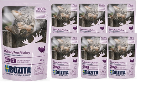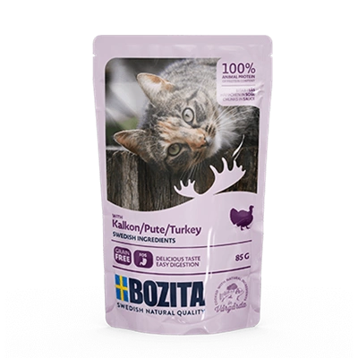 Bozita wet food is suitable for cats at any stage of development. Bozita wet food in sachets in sauce is Swedish quality and tasty food for your cat containing all essential vitamins, amino acids and minerals. Turkey-flavoured food.