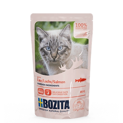 Bozita wet food is designed for cats at all stages of development. The ingredients are all natural, fresh and come straight from the Swedish countryside or wild areas, and have amino acids, vitamins and minerals in the composition to guarantee your cat's well-being. Salmon-flavoured food.