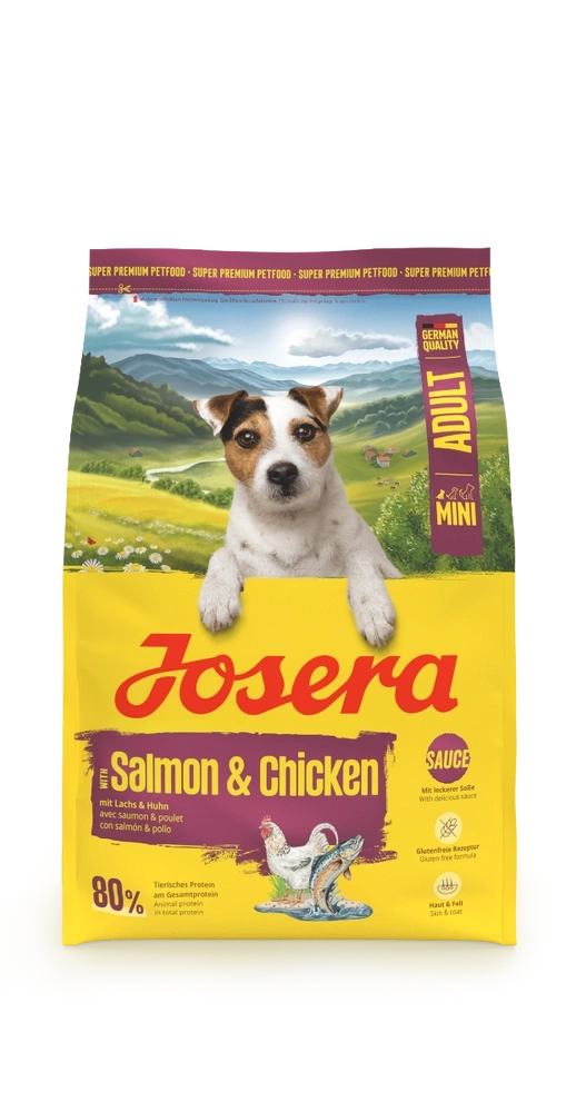 Even our little four-legged friends won't say no to a tasty meal – so now they can find something truly special in their bowl: Josera Mini Salmon & Chicken! This food is specially designed for adult dogs of small breeds – a miniature version of our popular gluten-free Festival food.