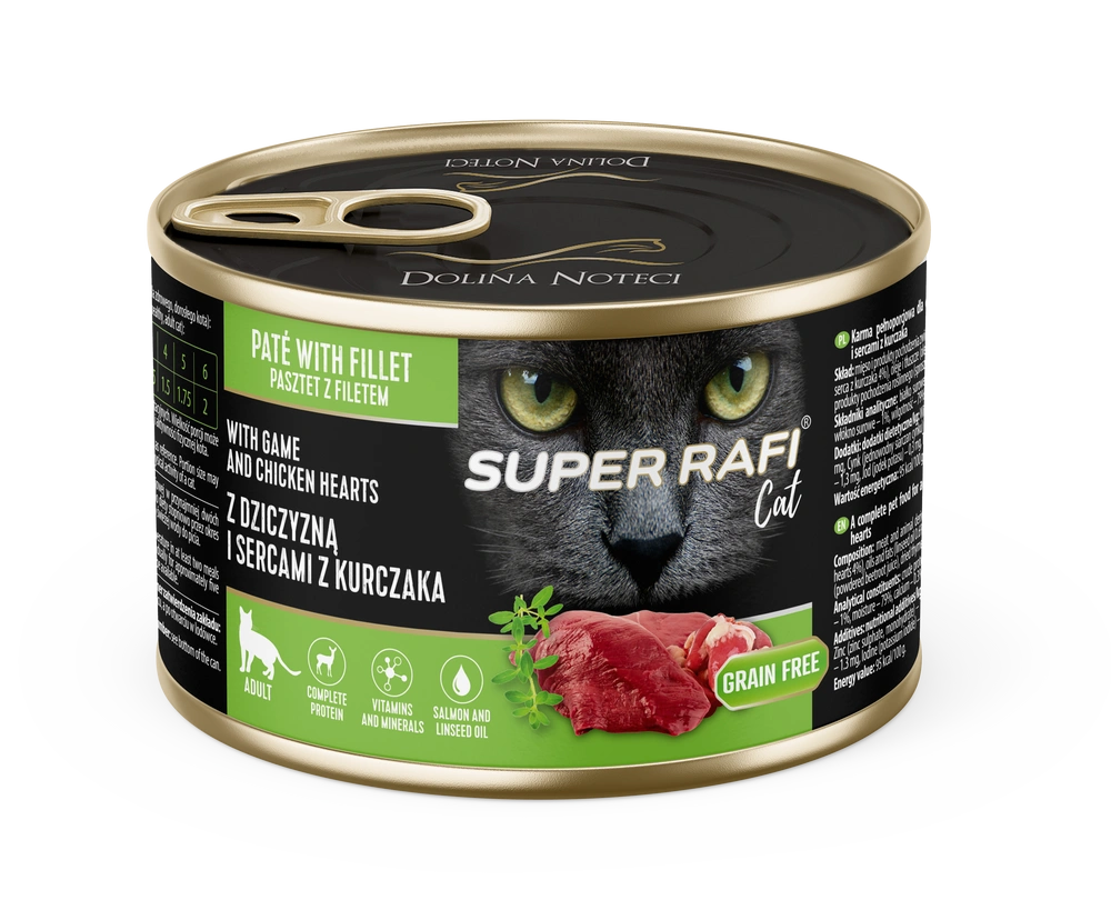 Super Rafi Cat with venison and chicken hearts is a complete food that fully covers the daily nutritional requirements of adult cats. The high content of meat and animal products (70%), including chicken fillet, venison, and hearts, guarantees a source of highly digestible protein with high biological value.