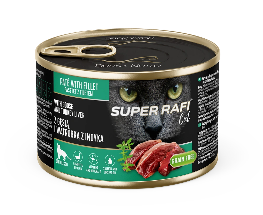 The Super Rafi Cat formula with goose and turkey liver has been specially developed for cats after sterilization. The reduced fat content and the addition of L-carnitine and DL-methionine to the recipe help maintain a healthy weight and urinary tract.