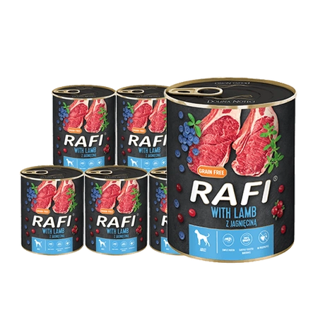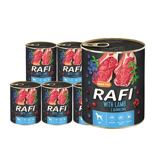 Rafi wet food contains the right proportions of selenium and copper. The addition of thyme contributes to the sensory appeal of this wet food. Meat and raw materials from lamb are also a source of the amino acids methionine, isoleucine and cystine. Blueberries and cranberries, sources of many valuable vitamins and nutrients, add to the value of the food.