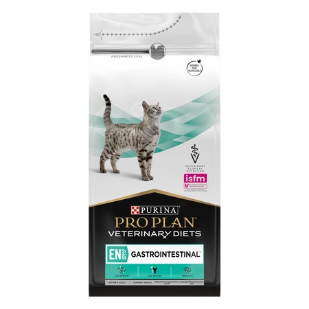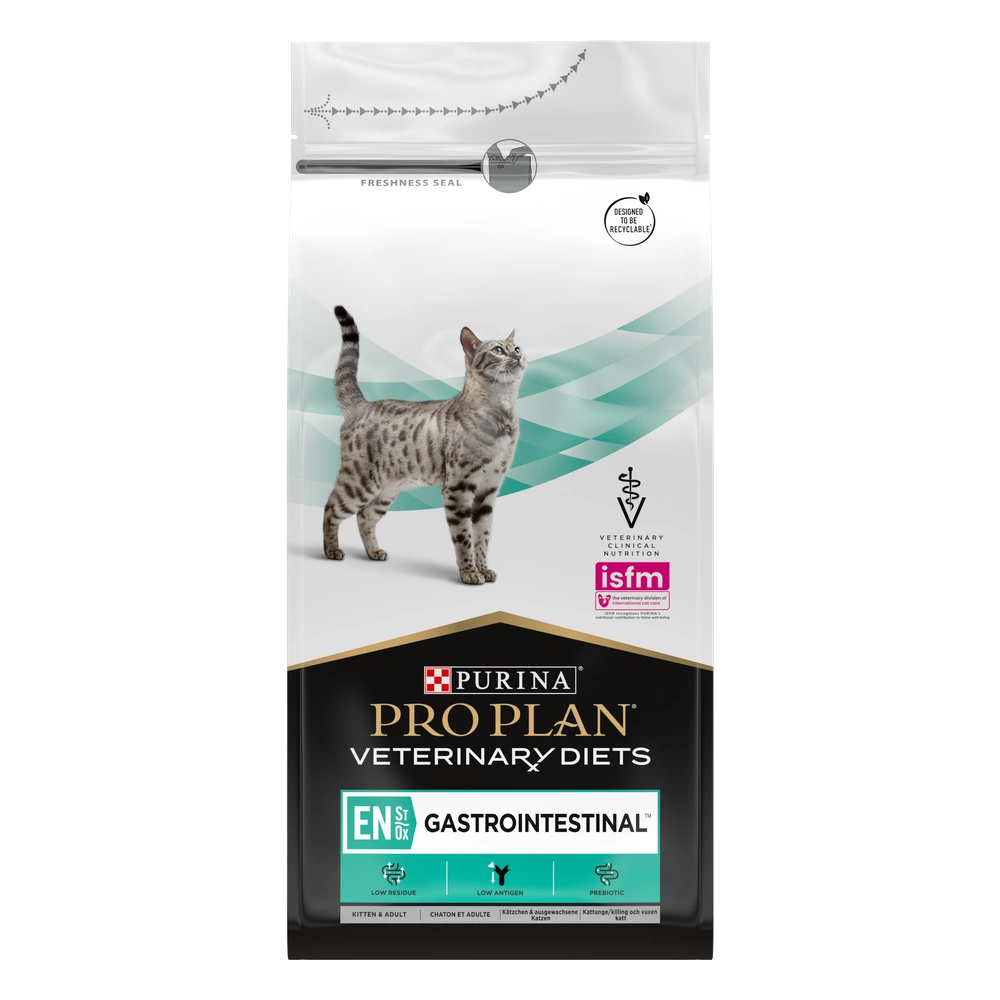 PURINA Veterinary Diets EN Gastrointestinal is food for cats with gastrointestinal disorders, liver disease without accompanying encephalopathy, and food intolerance. Highly digestible to ensure high nutrient absorption and minimize the burden on impaired intestines.