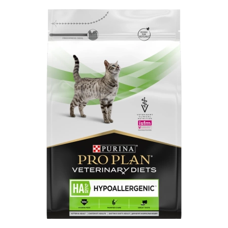 PURINA Veterinary Diets HA Hypoallergenic is a veterinary food for cats of all ages with allergic dermatitis and digestive disorders. It contains hydrolyzed soy protein with a low molecular weight, which reduces the risk of allergic reactions.