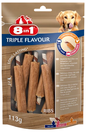 The original recipe contains a unique combination of pork and beef skin, accompanied by meaty and aromatic chicken breast. 8in1 Triple Flavour Ribs with increased meat content have been carefully prepared and packaged to keep your dog entertained and occupied for longer. Tasty, high-protein, yet low-fat 8in1 Triple Flavor Ribs provide long-lasting chewing and help maintain overall oral hygiene. These meat chews are formulated to satisfy your dog's natural chewing instinct. A treat for adult dogs weighing 2-35kg.