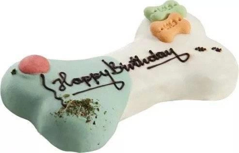 - A treat for dogs of all breeds and sizes, with a meat and vegetable flavor, bone-shaped, packed in a decorative box with "Happy Birthday" written on it. 250g package.