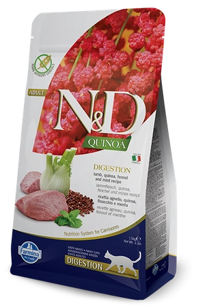 Farmina N&D Quinoa Digestion is a complete and grain-free dietary food for adult cats recommended to compensate for digestive disorders and for exocrine pancreatic insufficiency. Recipe of lamb, quinoa, fennel and mint.