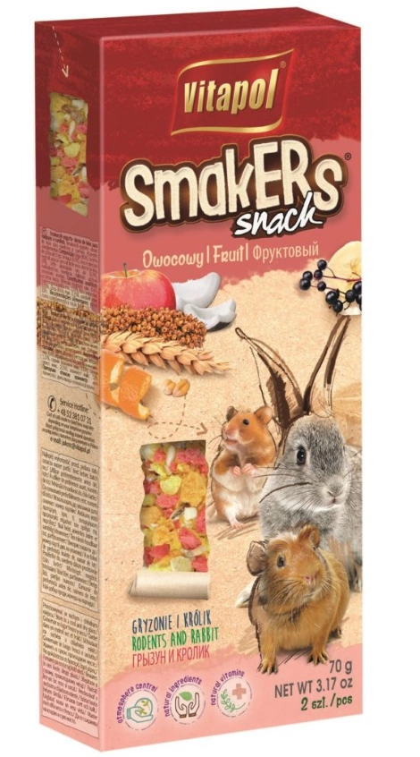 Smakers provide variety and supplement the diet of rodents and rabbits. Rich in many vitamins, minerals, and pectins, which come from ripe, top-quality fruits such as apples, raspberries, red currants, and elderberries. Elderberries provide the body with vitamin C, carotenoids, iodine, pectin, tannins, and mineral salts. The presence of coconut shavings enriches the stick with iron, potassium, and valuable protein. 80% handmade. The appropriate hardness ensures that, in addition to their nutritional value, Vitapol Smakers also ensure regular abrasion of the incisors of rodents and rabbits.