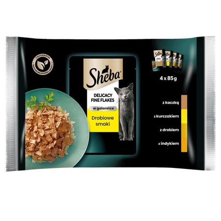 SHEBA Delicacy Fine Flakes Poultry Flavours pouches 4x85 g – complete wet food for adult cats, in jelly (pieces with: duck, chicken, poultry, turkey)