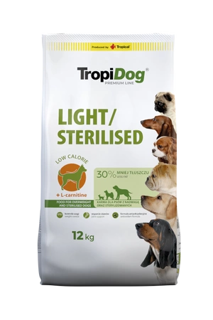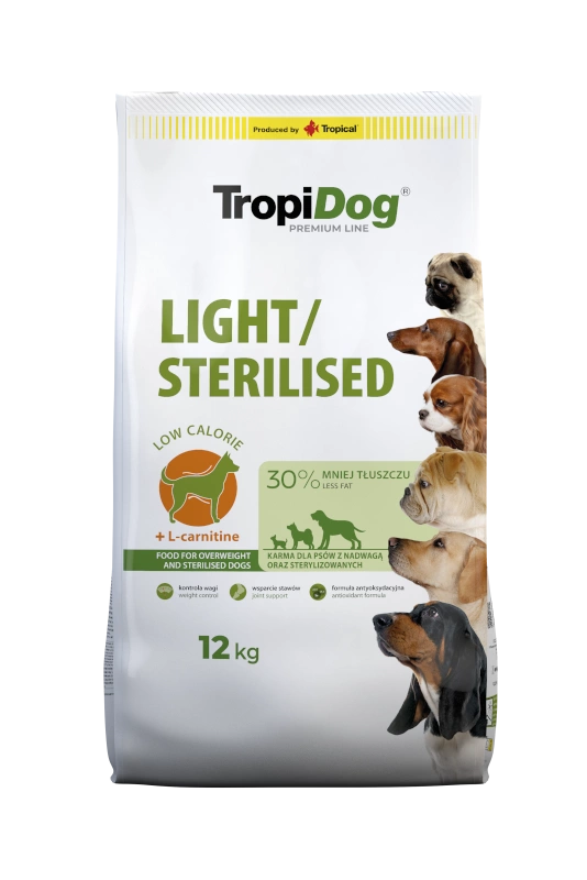 TropiDog Adult All Breeds Light is a high-quality, low-calorie food for adult dogs of all breeds and sizes that are overweight, prone to weight gain, have a low-activity lifestyle and are sterilised. It is also ideal for maintaining optimal body weight after a period of weight loss. Regular use of the food and increased physical activity help to maintain a healthy body weight.