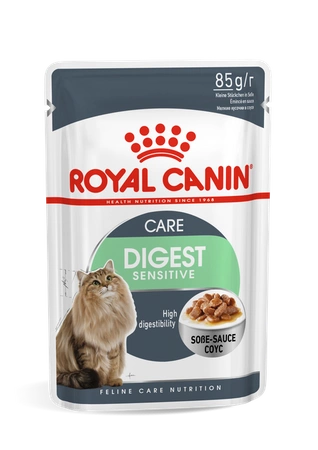 ROYAL CANIN Digest Sensitive, in the form of chunks in a tasty sauce, has been specially developed for cats with sensitive digestive tracts and is characterized by high digestibility and specially selected ingredients that help reduce stool odor. ROYAL CANIN Digest Sensitive in the form of chunks in sauce is extremely palatable and will satisfy even the most finicky appetite. Thanks to its low fat content, the food helps maintain optimal body weight. Food for cats over 1 year old.