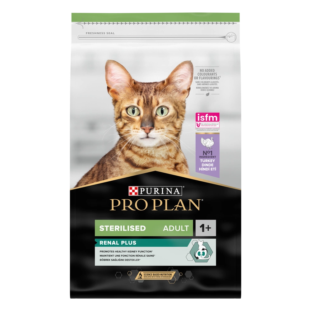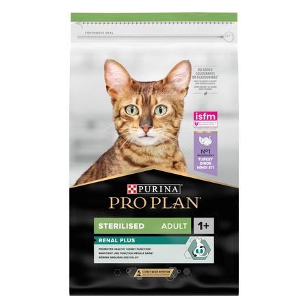 Purina PRO PLAN STERILISED rich in turkey with the unique OPTIRENAL formula is a dry food for sterilised cats that supports kidney health and reduces the risk of urinary stone formation. PURINA Pro Plan Cat Sterilised is a complete food for cats over 1 year of age after neutering/sterilisation.