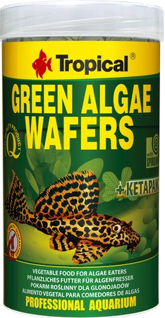 Green Algae Waffers are an excellent addition to the diet of omnivorous demersal fish species and freshwater and marine crustaceans. Green Algae Waffers are a food with very high hydrostability (by soaking in water, they retain their structure and do not disintegrate), which makes feeding easier for crustaceans and enables a close-to-natural way of feeding for fish, whose mouth opening is transformed into a sucker equipped with teeth for rubbing the food off hard surfaces. The wafers, even lying on the bottom of the aquarium for a long time, do not disintegrate and do not soil the water.