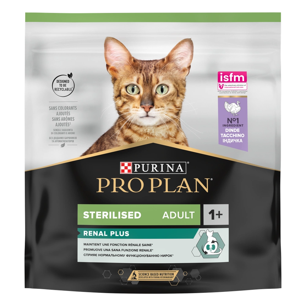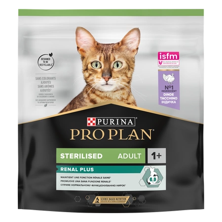 Purina PRO PLAN STERILISED rich in turkey with the unique OPTIRENAL formula is a dry food for sterilised cats which supports kidney health and reduces the risk of urinary stone formation. PURINA Pro Plan Cat Sterilised is a complete food for cats over 1 year of age after neutering/sterilisation.